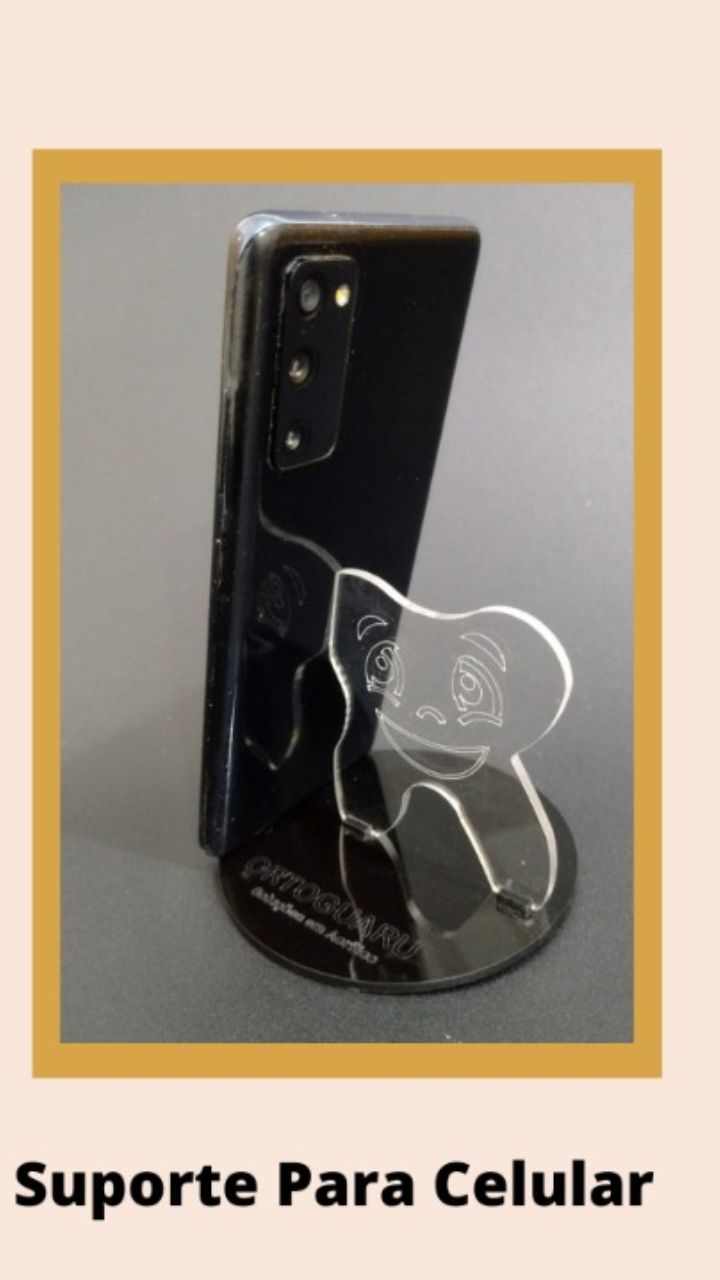 Suporte para celular transparente acrílico em formato de dente. Ótima decoração para sua mesa.